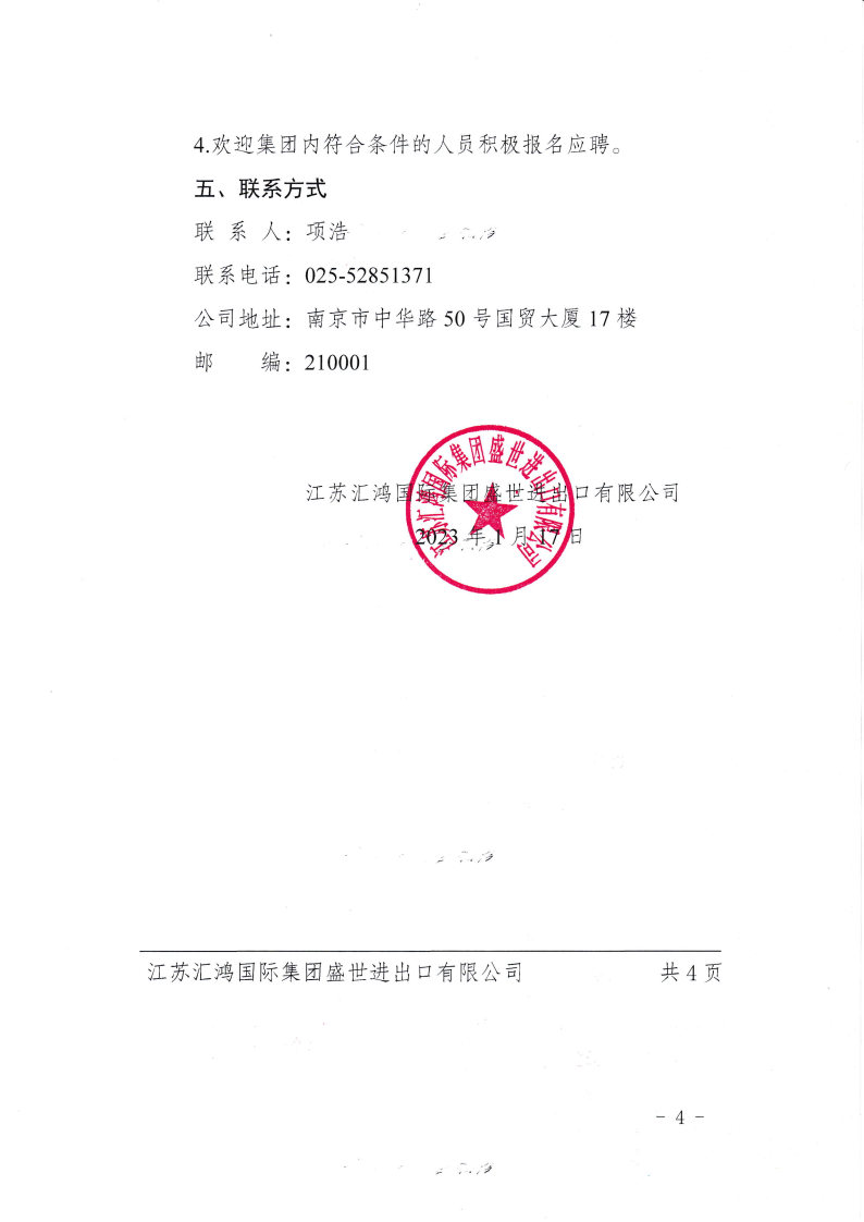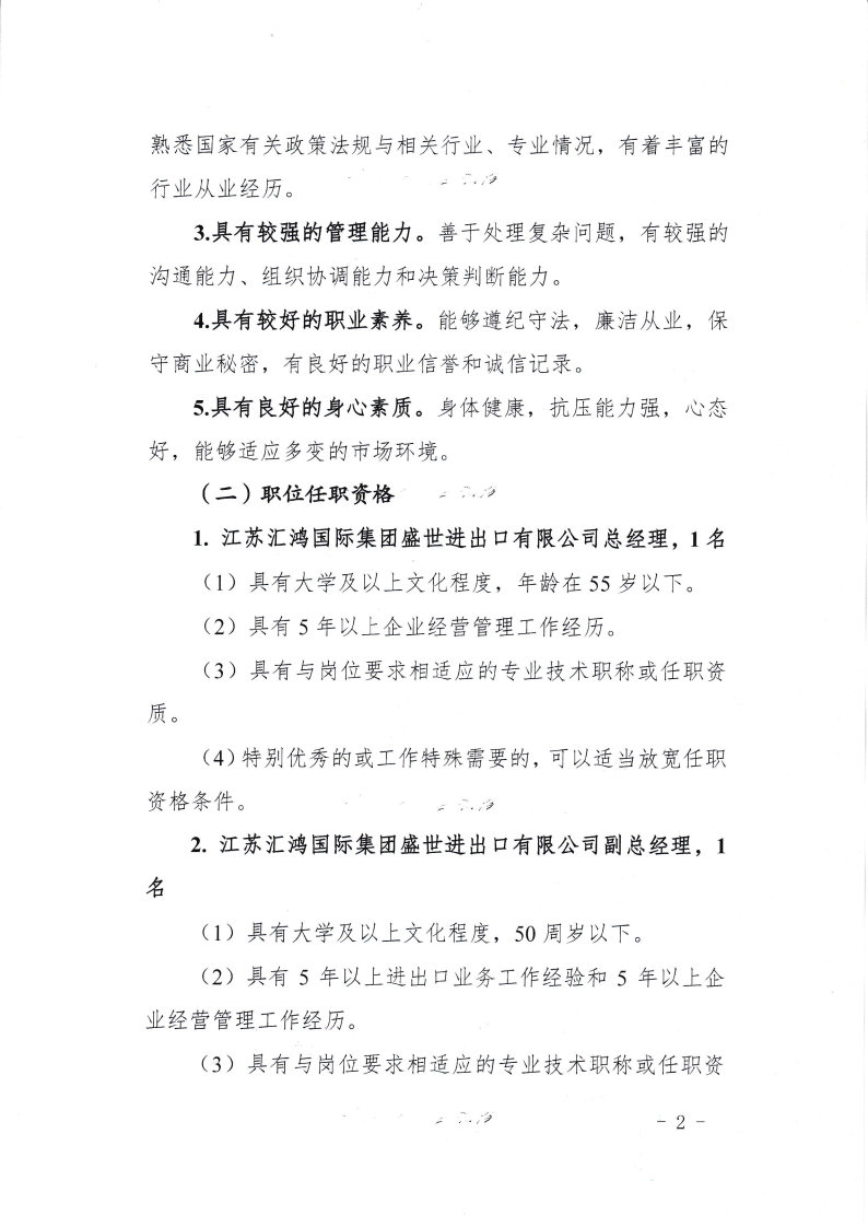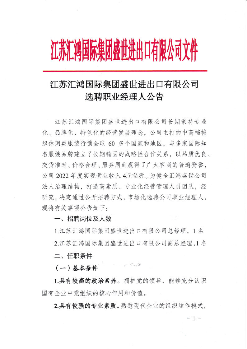 江蘇匯鴻國(guó)際集團(tuán)盛世進(jìn)出口有限公司選聘職業(yè)經(jīng)理人公告